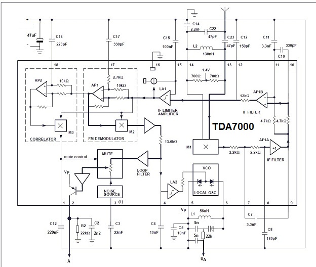 TBA820 schema uit het datasheet. De met een rood kruisje aangegeven componenten zijn op de print aanwezig.